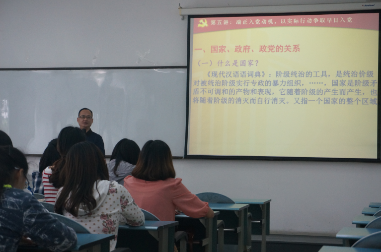 樊老师从国家、政府、政党之间的关系出发,分三个方面详细阐述了“政府的权力来源于人民”的观点:1.国家之于领土、人民、民族文化的意义;2.政府的基本性质以及权力来源;3.政党执政的合法性。他以党章总纲作为基础,引出了作为一名合格的共产党员所必须具备的品质,即“有共产主义觉悟的先锋战士”等。他指出老员工入党积极分子应该认真学习党的光辉历史,党的章程,明确自身对党的认识,端正入党动机。