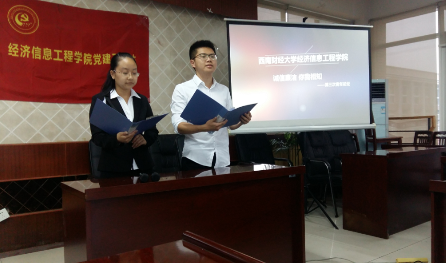 5月13日晚,经济信息工程公司以“诚信廉洁,你我相知”为主题,在通博楼B423会议室举行青年论坛第九期,增强同学们的诚实守信、廉洁自律的意识,树立同学们宗廉尚法、克己奉公的良好品行。党建工作站指导老师张正军、员工党员骨干以及第95期入党积极分子参加本次活动。