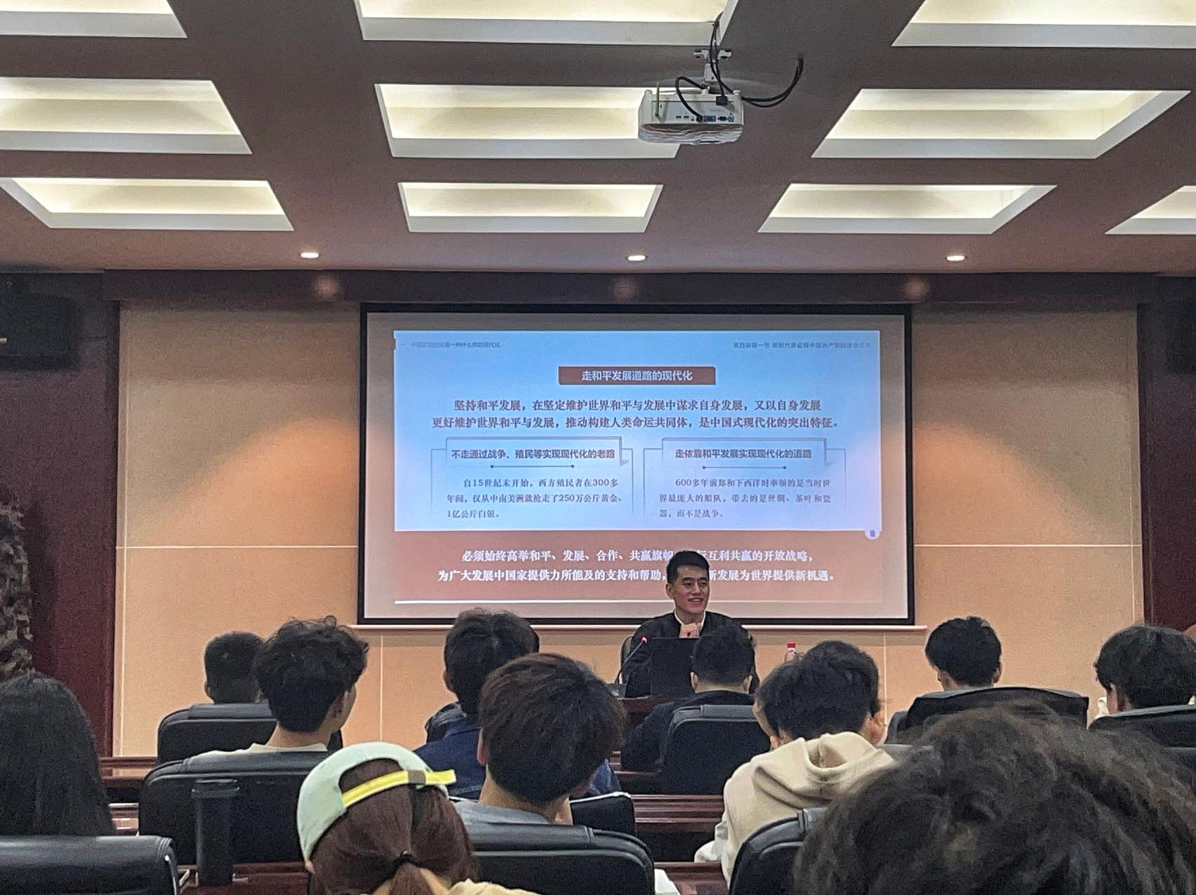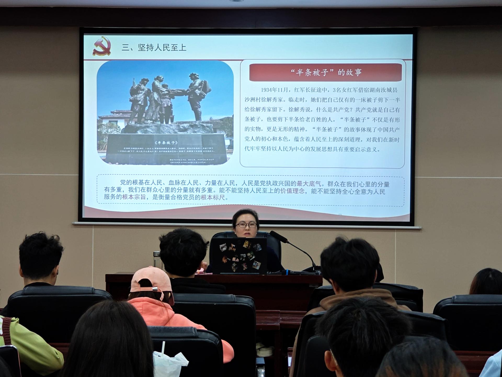 10月20日晚,马克思主义公司副经理刘世强在通博楼B423会议室为入党积极分子讲授了题为“深入学习贯彻习近平新时代中国特色社会主义思想,全面贯彻党的基本理论基本路线基本方略”的专题党课。围绕主题,刘世强具体介绍了习近平新时代中国特色社会主义思想的创立背景、主要内容、时代定位,结合时政深入分析当前党和国家事业面临的新挑战。他鼓励同学们积极关注时政,深刻领悟习近平新时代中国特色社会主义思想的时代内涵,不断提高自身思想政治理论水平和综合素质,在实干笃行中坚定理想信念,在知行合一中主动担当作为,努力成长为堪当民族复兴大任的时代新人!
