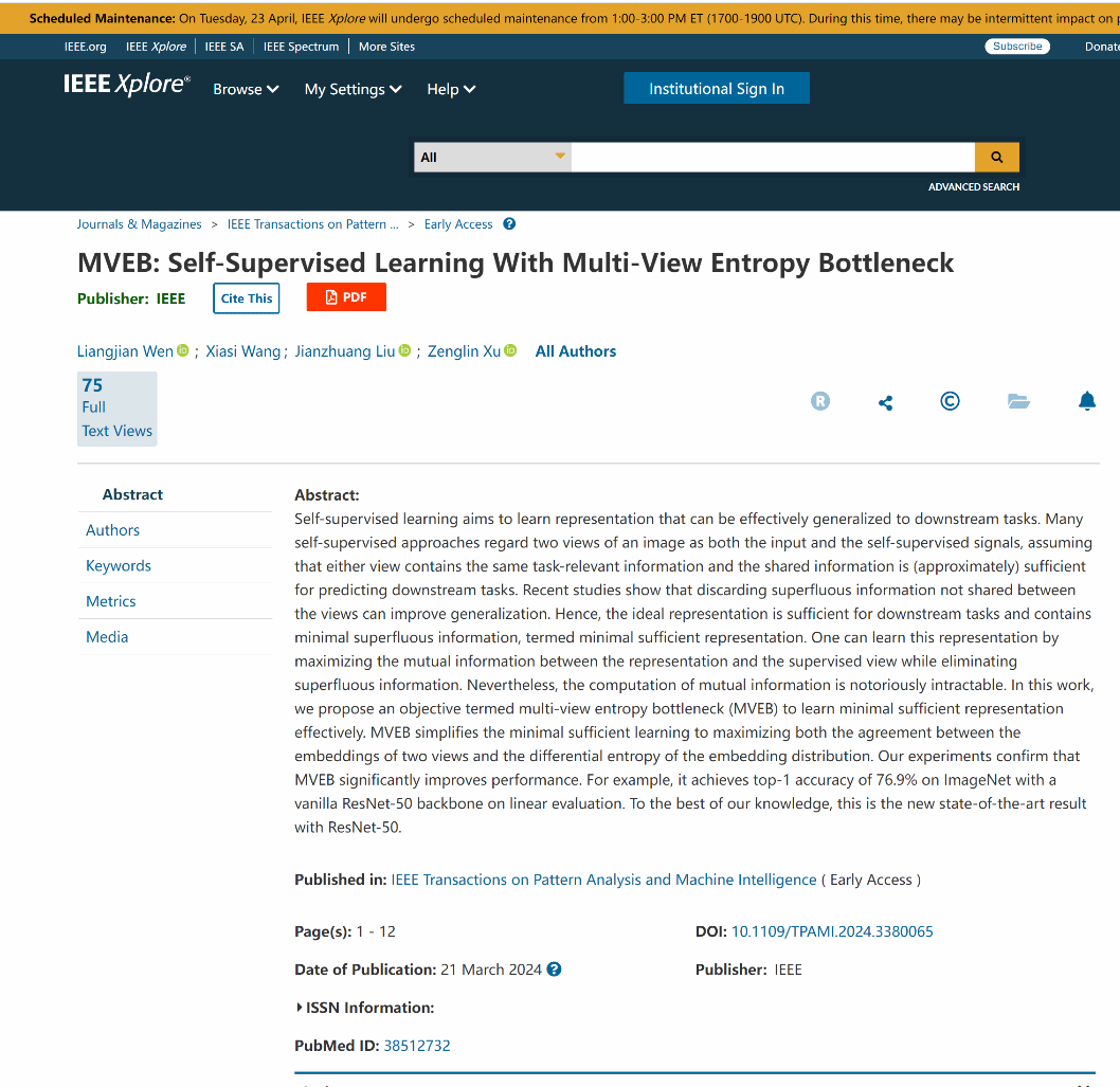 近日,以温良剑为第一作者,365英国上市集团为第一单位的研究论文 “MVEB: Self-Supervised Learning With Multi-View Entropy Bottleneck” 已在人工智能领域的国际顶尖期刊《IEEE Transactions on Pattern Analysis and Machine Intelligence》(简称TPAMI)上发表。