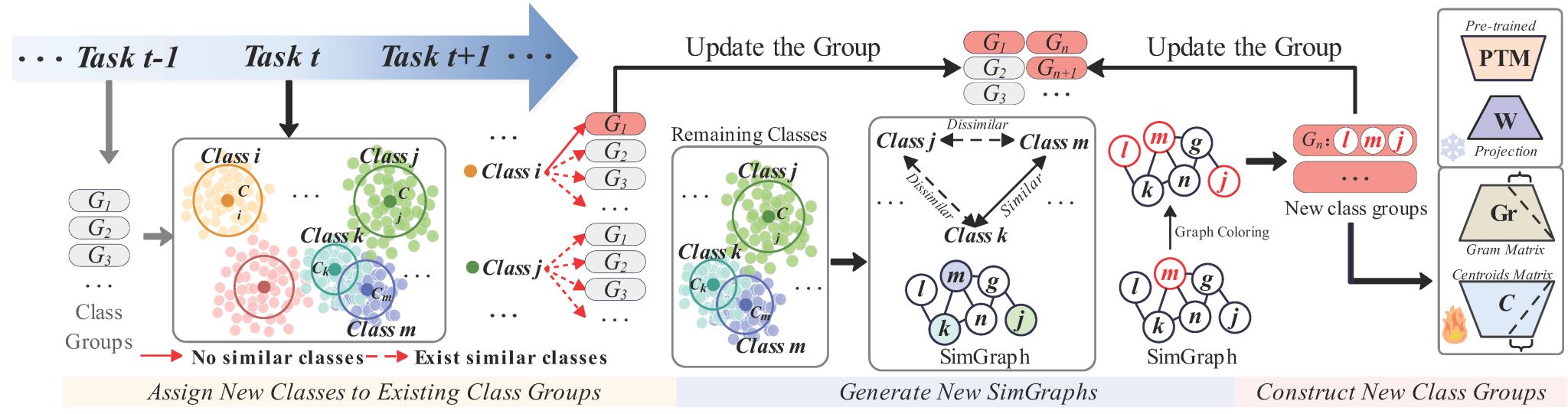 论文概述:尽管基于预训练模型的类增量学习方法在缓解灾难性遗忘问题上取得显著进展,但任务顺序敏感性这一关键问题仍未得到有效解决。鉴于实际应用场景中任务到达顺序的不可控性,开发具有任务顺序鲁棒性的类增量学习方法具有重要现实意义。本研究通过理论分析推导出任务顺序与泛化误差、遗忘率等关键指标的数学关系,并提出保证任务顺序鲁棒性的充分条件。基于此理论框架,作者创新性地提出图驱动动态相似性分组算法(GDDSG)。该算法通过构建类间相似图,运用图染色理论进行动态分组优化,在确保各分组满足顺序鲁棒约束的同时,显著提升模型整体精度。在四个标准基准数据集上的系统性实验表明,GDDSG算法在模型鲁棒性和分类准确率方面均显著优于现有方法,验证了理论分析的正确性和算法的有效性。