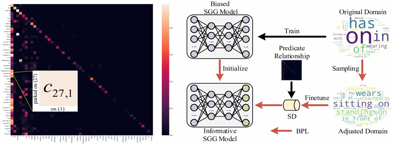 成果一:Informative Scene Graph Generation via Debiasing,期刊International Journal of Computer Vision(IJCV)(吕新昱副教授为通讯作者)。为解决场景图生成任务中的有偏预测问题,本研究分别从“语义空间”与“样本空间”的不平衡角度,提出了语义去偏模块(SD)和平衡性谓词学习框架(BPL)。平衡性学习框架通过引入随机欠采样与语义消歧策略构建信息丰富且平衡的目标域,并通过轻量级微调实现高信息量的视觉关系预测;同时,语义去偏模块则利用混淆矩阵和二分图构建谓词关系转移矩阵,并在预测过程中结合转移概率进行语义校正,从而有效缓解预测偏差。