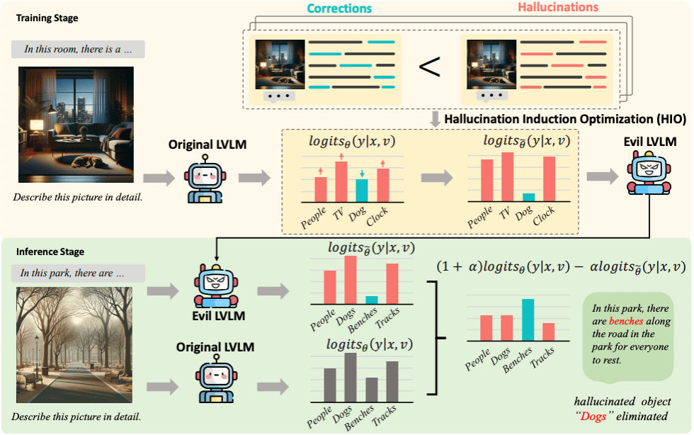 成果三:Alleviating Hallucinations in Large Vision-Language Models through Hallucination-Induced Optimization,第38届神经信息处理系统会议(Thirty-eighth Conference on Neural Information Processing Systems,NeurIPS)(吕新昱副教授为第一作者)。该论文对多模态大模型幻觉问题进行了深入的理论分析,并证明了区分“幻觉标记”和“目标标记”可以显著提高对比解码方法在减轻幻觉方面的有效性;据此提出了基于幻觉诱导的对比编码策略(HIO),其通过引入逆布拉德利-特里模型(CBTM)与多重目标幻觉放大策略(AMTH),增大幻觉与目标词间的对比度,以降低幻觉发生概率,从而提升多模态大模型对视觉场景的鲁棒理解能力。