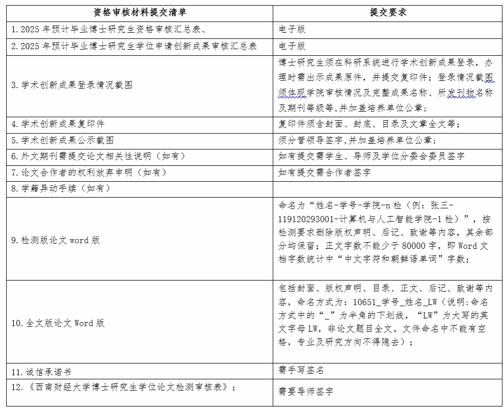 提交博士研究生学位申请资格审核材料须严格按下列清单整理(如学术创新成果预计在2025年9-11月正式发表,请联系公司),具体包括: