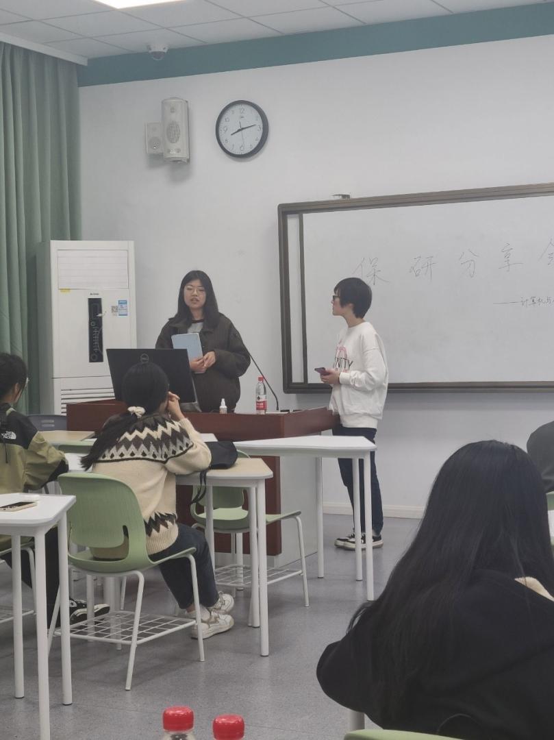 分享会上,胥汶渲(已保研电子科技大学)先着重介绍了她在大学时期为保研做的准备,鼓励大家要打好专业基础,为考研与比赛做好准备,之后强调了英语在保研过程中的重要性,并提供了英语口语练习的经验,最后建议同学们在参加夏令营和预推免时要提前分类、整理并熟悉自己的资料,让自己的简历脱颖而出,并对每次面试及时复盘,不断进步。