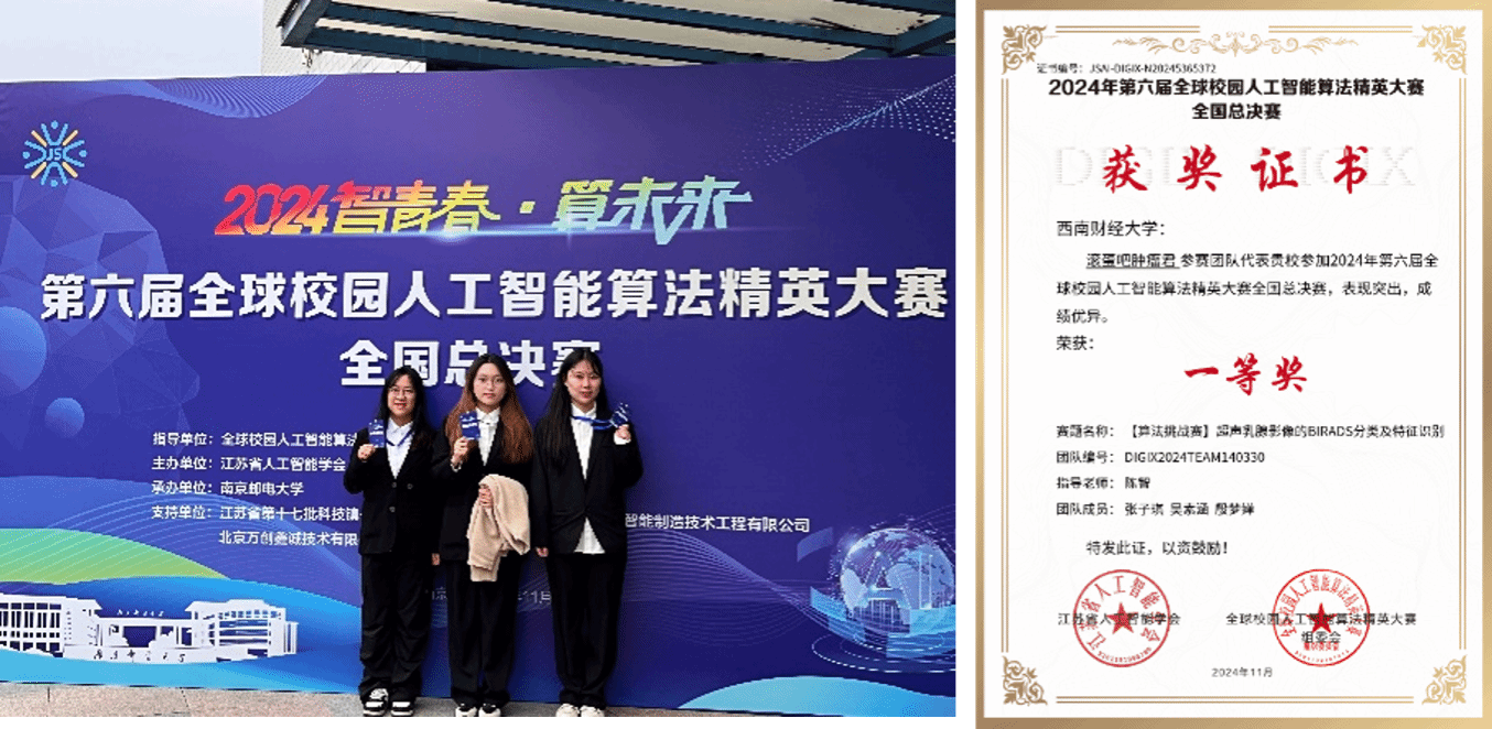 11月17日,在第六届全球校园人工智能算法精英大赛全国总决赛在南京邮电大学举行。公司2022级本科生张子琪、吴素涵和殷梦婵三位同学组成的“滚蛋吧!肿瘤君”队,使用自己设计和实现的深度学习模型对肿瘤图像数据进行高精度识别。在这场自全国166所高校、1165支参赛团队参与的“人工智能算法比拼”中获得全国一等奖。