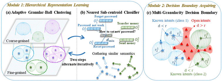 论文一:《Multi-Granularity Open Intent Classification via Adaptive Granular-Ball Decision Boundary》(认知计算与群智协同创新团队博士生李艳花为第一作者,杨新教授为通讯作者)。传统的基于边界的开放意图分类方法通常假设已知意图分布在紧凑的球形区域内,依赖于粗粒度的特征表示和精确的球形决策边界。然而,这些假设在实际场景中往往不成立,导致难以通过单一的球形边界有效区分已知意图与未知意图。针对上述问题,论文提出了一种基于自适应粒球决策边界的开放意图分类方法 (MOGB)。MOGB通过层次表征学习方法捕捉已知意图类别内部的细粒度语义结构,利用多个粒球拟合意图类别内部的真实分布信息,通过构建多粒度决策边界实现开放意图分类。在三个公开数据集上的大量实验证明了所提方法的有效性。