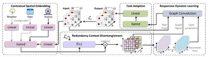 论文三:《Responsive Dynamic Graph Disentanglement for Metro Flow Forecasting》(可信人工智能与行业大数据创新团队高强副教授、硕士生王子铮、黄鹂老师、刘贵松教授)。论文提出用于准确理解地铁流量及外部因素的时空动态的新型响应式动态图神经网络ReDyNet,采用响应机制来适应地铁流量及外部影响变化的同时结合信息瓶颈(IB)理论中的冗余解耦技术,有效提升情境空间信号的清晰度和准确性。