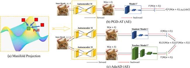 论文二:《Enhancing the Adversarial Robustness via Manifold Projection》(可信人工智能与行业大数据创新团队硕士生李志挺为第一作者、蒋太翔教授为通讯作者)。论文在可信人工智能领域提出了一种新颖的对抗防御范式,将基于自编码器的流形投影集成到现有对抗训练和对抗蒸馏方法的鲁棒框架中。流形投影将对抗样本对齐到干净样本的流形上,从而削弱攻击强度,并简化从对抗样本到正确标签的学习过程。