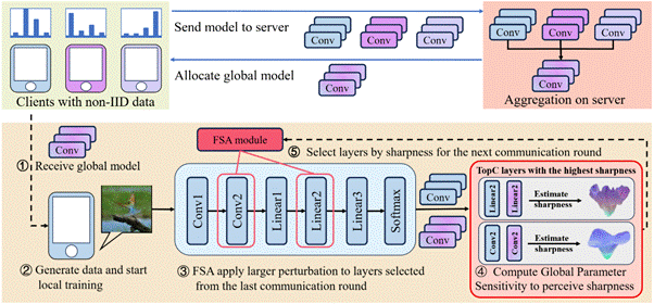 论文五:《Flexible Sharpness-Aware Personalized Federated Learning》(可信人工智能与行业大数据创新团队占求港老师为共同第一作者、刘贵松教授为通讯作者)。论文提出一种能够灵活感知锐度的个性化联邦学习框架FedFSA,通过扰动敏感度对客户端模型的逐层锐度进行估计,根据锐度感知优化器(SAM)特性,自适应对锐度更大的参数区域增大SAM扰动,从而增强客户端的泛化性能。