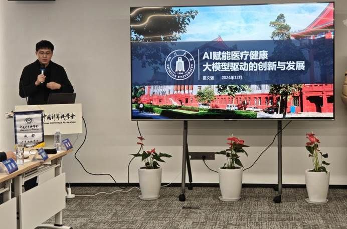 四川大学计算机公司经理助理雷文强教授进行了题为“AI赋能医疗健康大模型驱动的创新与发展”的报告,介绍了在“智能数字化优先”的大环境下,大模型Agent技术是如何与各行各业进行深度融合,高速推动各个行业的革新与升级,并分别从诊断辅助、治疗建议生成、医疗文献生成和分析等方面分析了AI大模型的一些优势和应用。