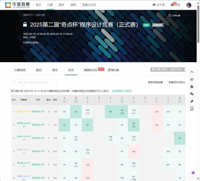 本次竞赛吸引了来自校内13个公司的108名选手及52所高校的290名外校选手同台竞技,线上线下联动,共同呈现了一场高水平的编程盛宴。竞赛采用牛客竞赛平台,现场选手们紧盯屏幕,指尖飞舞。经过4小时激烈角逐,公司6名选手斩获金奖,12人获银奖,19人获铜奖。其中,大一大二年级的优胜者获得丰厚奖金,最快解题奖选手则收获了特色校园文创奖励。