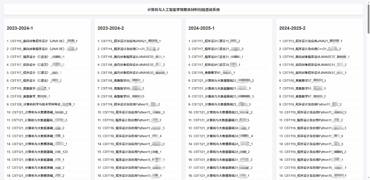 系统开发团队负责人周峰老师介绍,二期系统通过浏览器端网络应用系统的开发,显著提升了用户体验。二期系统的核心突破之一在于解决了传统非电子阅卷试卷的数字化管理难题。过去,教师需手动比对班级名单逐一重命名扫描文档,工作耗时耗力。新系统通过智能识别技术,可自动完成扫描文件的规范化命名,并智能合并同一员工的多页试卷,将复杂的命名操作简化为两次点击,实现了班级、员工、试卷数据的有机整合,工作效率提升显著。另外,针对审核评估工作中档案查阅不便的痛点,二期系统创新推出了在线查阅功能。审核评估专家可通过链接直接访问所需材料,支持浏览器内直接查看PDF及图片格式文件,无需反复拷贝存档。该系统延续了一期对标准格式的良好支持,确保了档案管理的规范统一,同时大幅降低了文件重复存储的管理成本。
