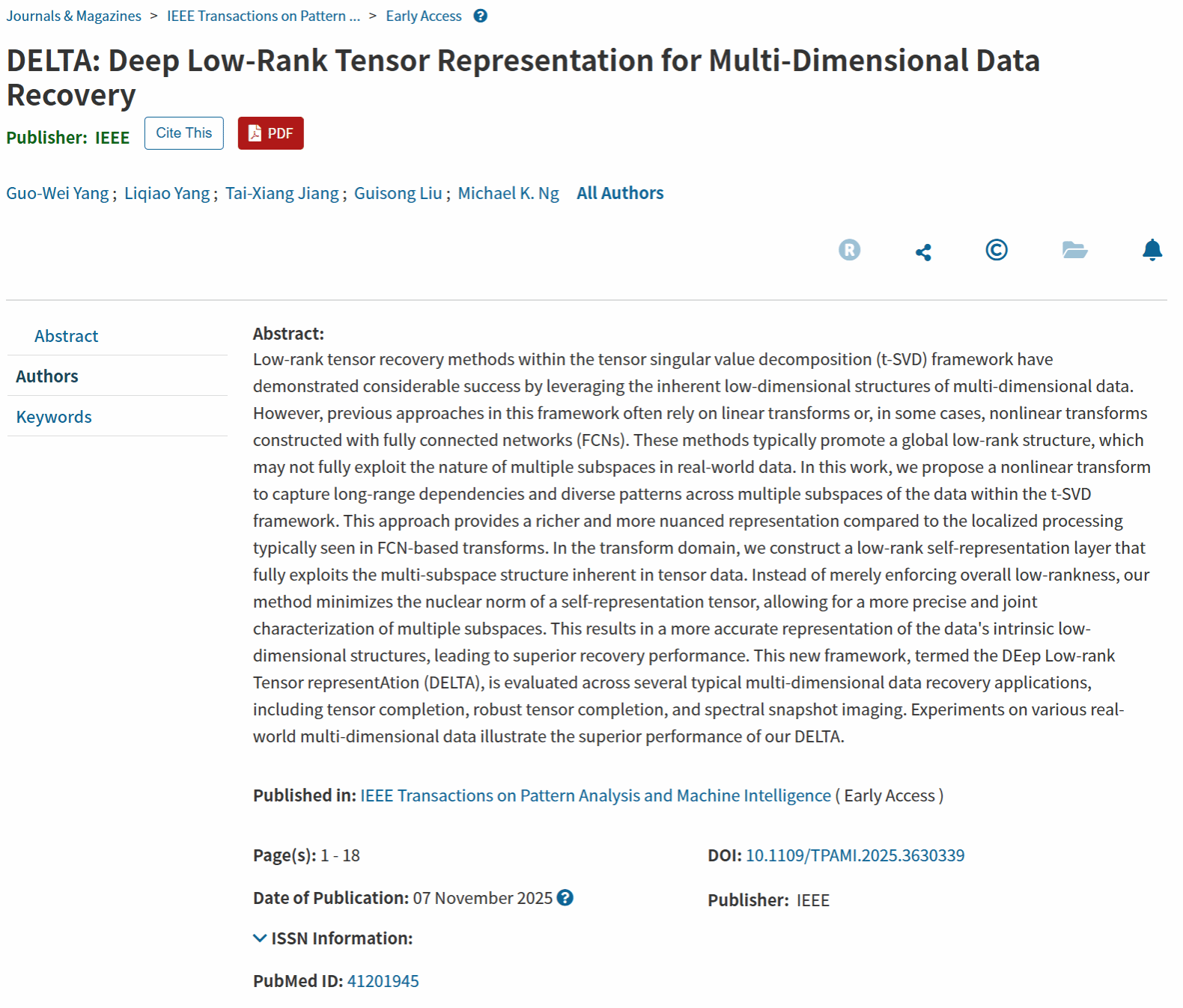 近日,365英国上市集团可信人工智能与行业大数据创新团队(新财经综合实验室)博士生杨国威(导师:蒋太翔教授)的研究论文“DELTA: Deep Low-Rank Tensor Representation for Multi-Dimensional Data Recovery”被人工智能领域顶级期刊IEEE Transactions on Pattern Analysis and Machine Intelligence (TPAMI)接收。论文作者包括杨国威(博士生)、杨丽巧博士(光华博士后)、蒋太翔教授(通讯作者)、刘贵松教授、吴国宝教授(香港浸会大学)。
