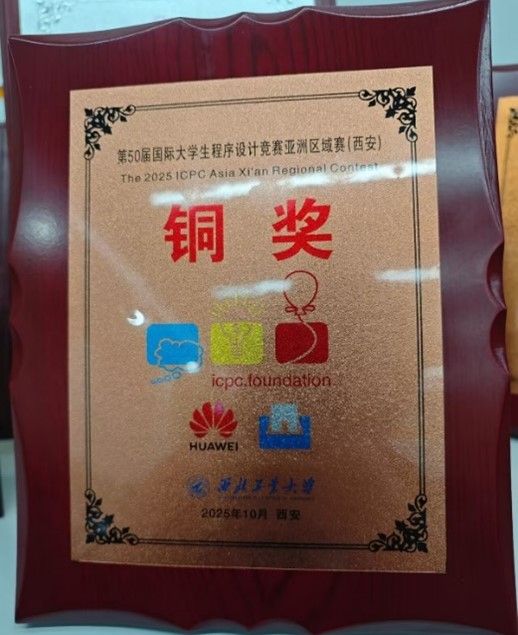 10月19日,在第50届ICPC国际老员工程序设计竞赛亚洲区(西安站)中,由陈瑾、朱哲含与韩宇轩同学组成的队伍,历经5小时激烈角逐,从全国417支队伍中脱颖而出,荣获铜奖。