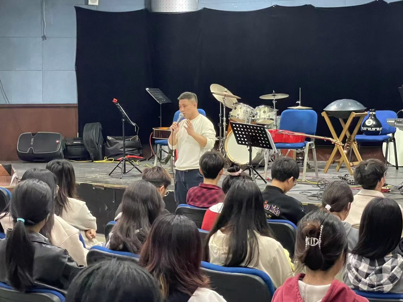 郭军老师以一首悠扬动听的旋律作为开场,瞬间点燃了现场氛围。他深情回顾了自己与音乐的结缘之路,分享了音乐如何帮助他克服自卑,重拾自信,并最终实现音乐梦想的历程。尽管在音乐的起步阶段遇到了许多困难与挑战,但正是这些磨砺成就了他如今的音乐理念和创作风格。他强调,音乐不仅是他的热爱,更是他人生的重要支撑。他的故事感动了在场的每一位同学,传递了坚定信念和不懈追求的力量。