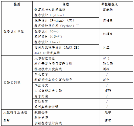 实践基础实体课程组:突出编程能力与工程素养,将实践与课程内容紧密结合,落实实践环节贯穿培养过程,巩固员工实践基础。下设课程组主要包括程序设计课程、实践实训课程以及科研竞赛,加强实践和实验环节方面的工作,通过实践课程、实习实训等多形式融合提升员工的工程能力、创新能力、动手能力、理论联系实践能力。主要课程包括:计算机与大数据基础、程学设计及应用、面向对象程序设计、科技竞赛、创新程序设计等。